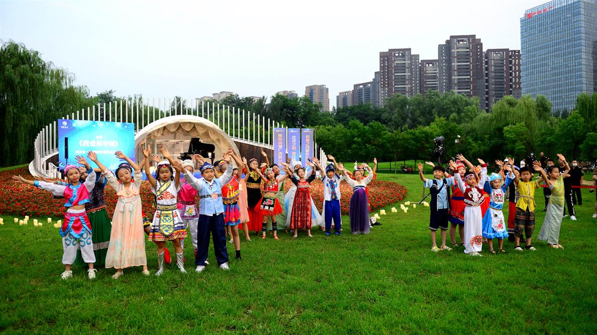 2023年7月12日拍攝于遼寧省沈陽市,身著不同少數(shù)民族服裝的學(xué)生在郎朗鋼琴廣場共唱-我愛你中國,繼續(xù)傳承和發(fā)揚(yáng)愛國主義教育