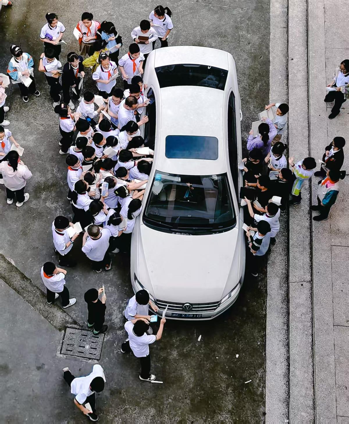中科院科學(xué)家來學(xué)校做講座后準(zhǔn)備坐車離開,被一群小學(xué)生團(tuán)團(tuán)圍住請求簽名。