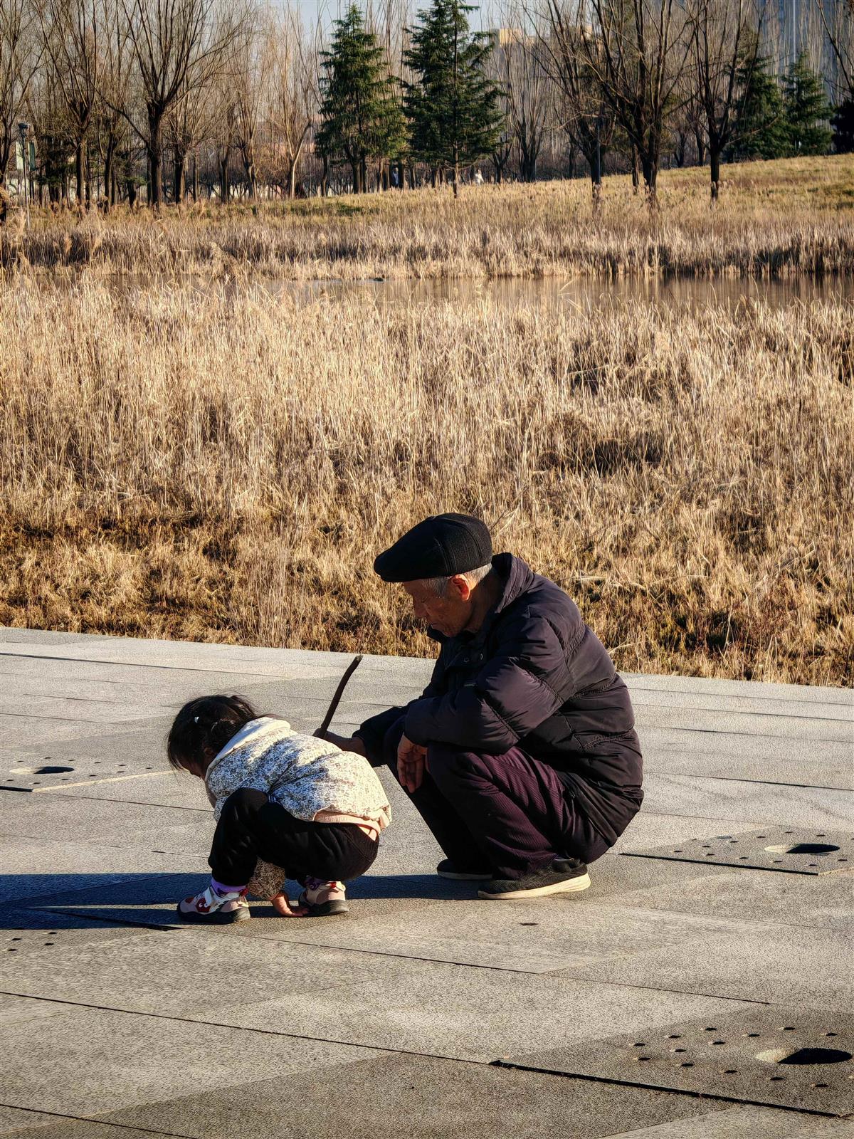 老人在地上拿樹枝教他孫女學(xué)習(xí)寫字