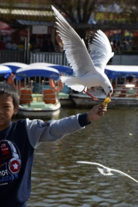 游客和野生天鵝和諧相處